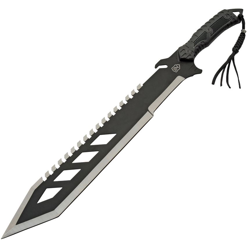 Model/Item/Part - SZ5606. Sierra Zulu - Trident Machete. 24" (60.96cm) overall. 17.75" (45.09cm) two- tone finish sawback 3Cr13 stainless blade. Black rubberized TPR handle. Full, extended tang. Lanyard hole. Black ballistic nylon belt sheath. Boxed. Made in China.