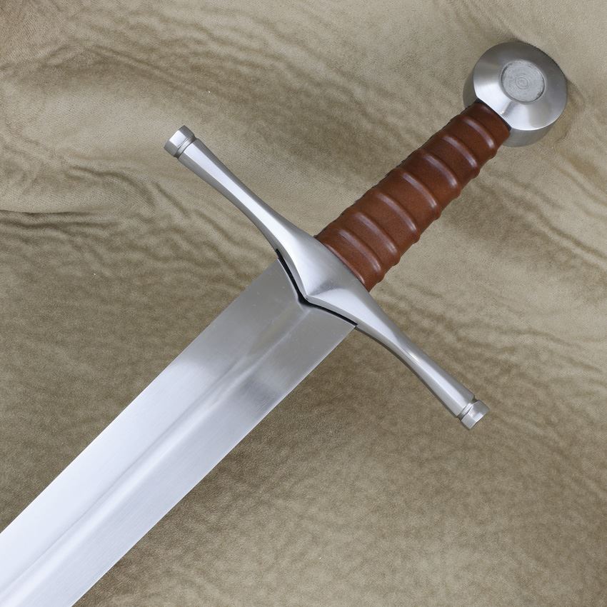 Model/Item/Part - FXSN85261. Factory X - Sword. 37" (93.98cm) overall. 29.5" (74.93cm) satin finish carbon steel blade. Brown leather wrapped handle. Stainless guard and pommel. Brown leather scabbard. Bulk packed. Made in India.