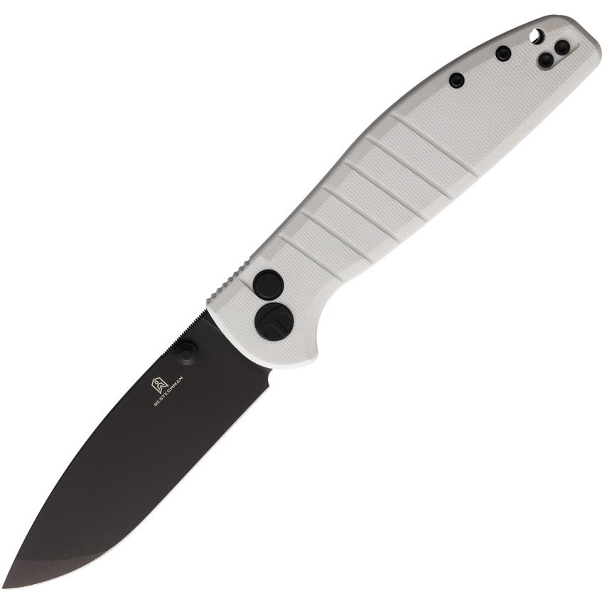 Model/Item/Part - BTKMK04J. Bestech - Bestechman Go Greenboy Button Lock Knife White Handles. 4.5" (11.43cm) closed. 3.5" (8.89cm) black DLC coated D2 tool steel blade. White G10 handle. Lanyard hole. Pocket clip. Thumb stud. Boxed. Made in China.