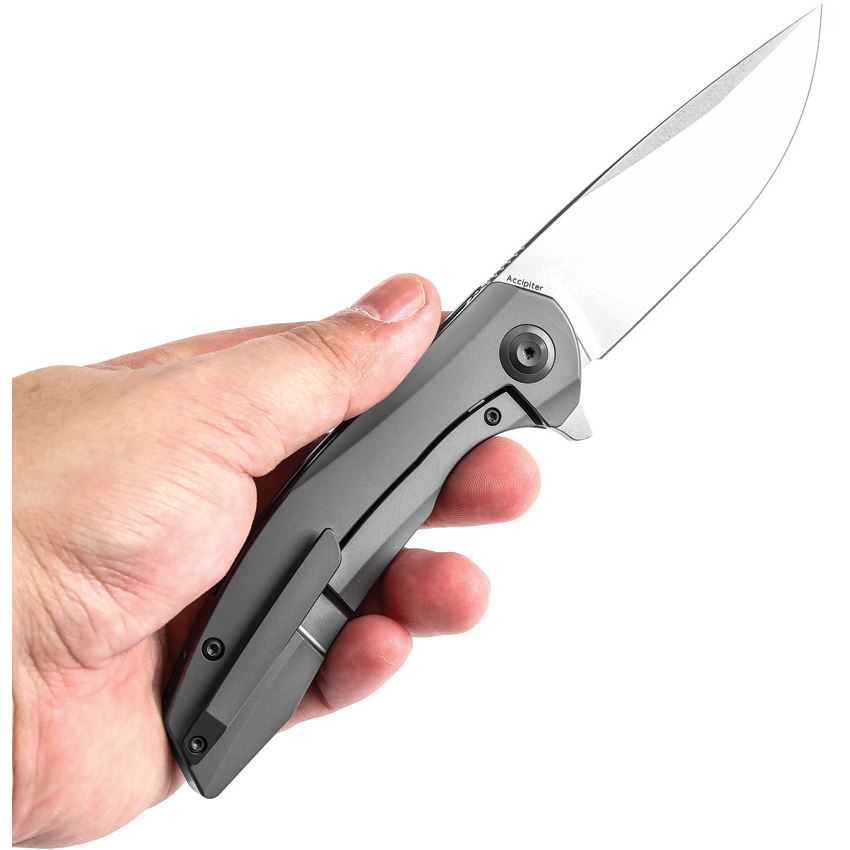 Model/Item/Part Number - K1007E1. Kansept Accipiter Stonewash Framelock Knife Gray/Green Handles. 4.63" (11.76cm) closed. 3.63" (9.22cm) stonewash finish S35VN stainless blade. Gray titanium handle with green carbon fiber inlay. Extended tang. Pocket clip. Black nylon pouch. Boxed. Made in China.