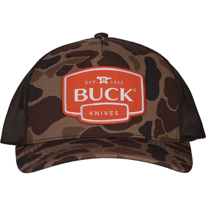 Model/Item/Part Number - BU89178. Buck Duck Camo Hat Bark. Buck Knives logo patch. Precurved visor and a cotton sweatband. Adjustable snap back. Color: Bark. 50/50 Ncyo Ripstop/Poly mesh construction. Size: One size fits most. Bulk packed. Made in China.