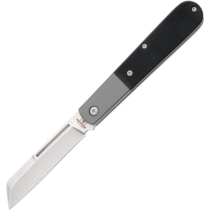 Model/Item/Part Number - BCMG180. Bear & Son Modern Large Barlow Stonewash Knife Black Handles. 4" (10.16cm) closed. Stonewash finish D2 tool steel sheepsfoot blade. Black G10 handle. Stainless bolster(s). Boxed. Made here in the USA.