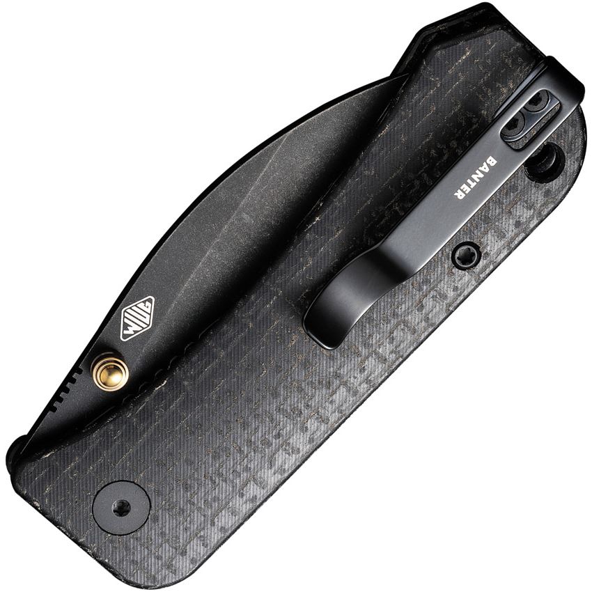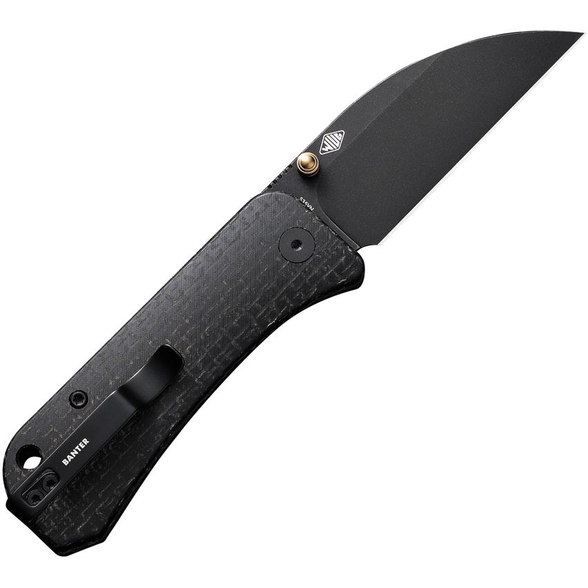 Model/Item/Part Number - WE19068J1. WE Banter Black Stonewash Wharncliffe Linerlock Knife Black Handles. 3.63" (9.22cm) closed. 2.88" (7.32cm) black stonewash finish S35VN stainless Wharncliffe blade. Black burlap micarta handle. Thumb stud. Lanyard hole. Pocket clip. Black nylon zippered storage case. Boxed. Made in China.