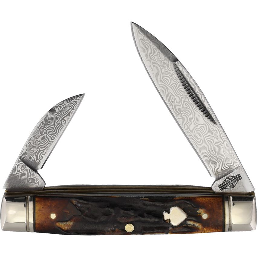 Model/Item/Part Number - RR2531. Rough Rider Capitol Intern Cinn Bone Dam. Cinnamon Bone 3.25" (8.26cm) closed. Damascus steel spear and Wharncliffe blades. Cinnamon jigged bone handle. Nickel silver bolster(s). Inlay shield. Boxed. Made in China.