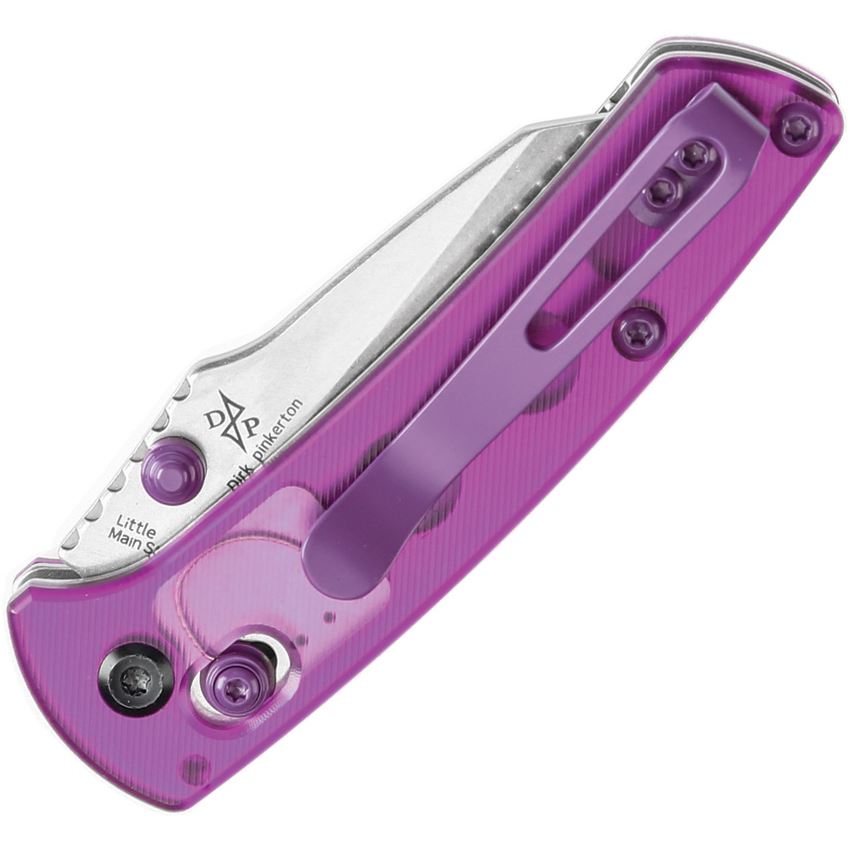Model/Item/Part Number - KT2015V2. Kansept Little Main Street Stonewash Crossbar Knife Purple Handles. 3.13" (7.95cm) closed. 2.25" (5.72cm) stonewash finish 154CM stainless blade. Purple acrylic handle. Pocket clip. Thumb stud. Black nylon pouch. Boxed. Made in China.