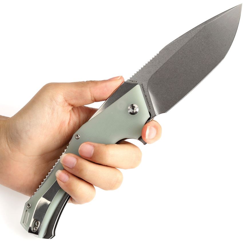 Model/Item/Part Number - KT1008F5. Kansept Hellx Stonewash D2 Framelock Knife Jade Handles. 5.25" (13.34cm) closed. 3.75" (9.53cm) stonewash finish D2 tool steel blade. Jade G10 handle. Extended tang. Lanyard hole. Pocket clip. Black nylon pouch. Boxed.Made in China.