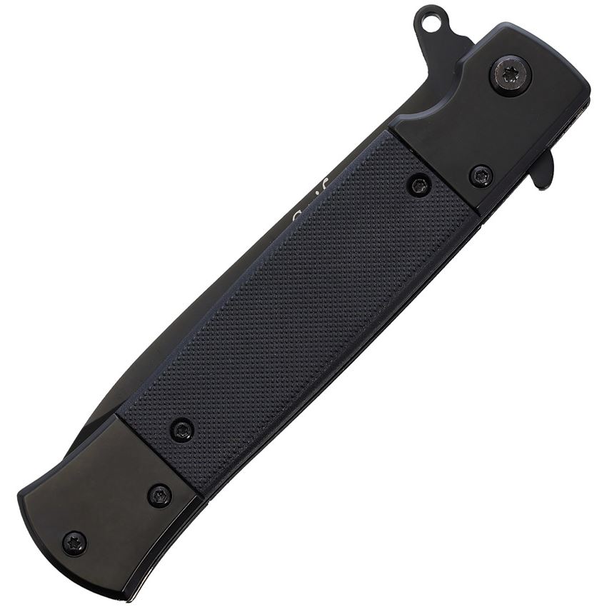 Model/Item/Part Number - EE10A96BK. ElitEdge Assist Open Black Stiletto Linerlock Knife Black Handles. Assisted opening. 4.75" (12.07cm) closed. 3.75" (9.53cm) black finish 420C stainless blade. Black stainless handle with black G10 inlay. Extended tang. Pocket clip. Boxed. Made in China.