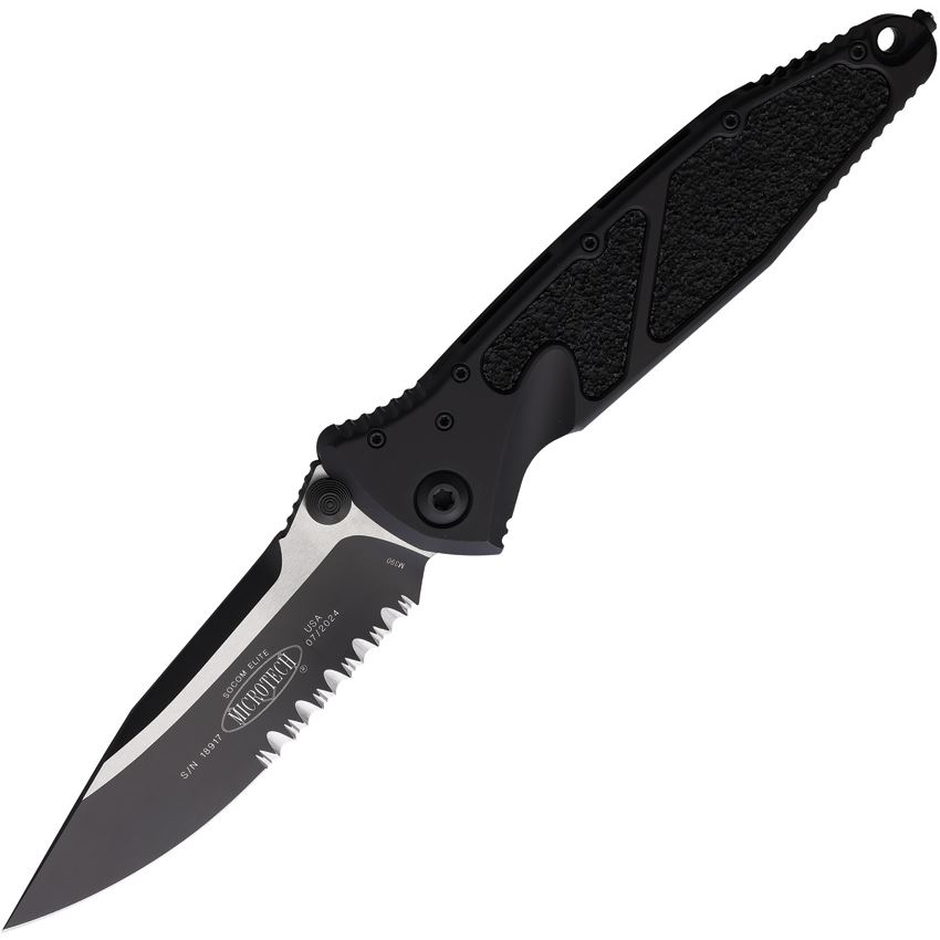 Model/Item/Part Number - MCT1602T. Microtech Socom Elite Part Serrated Single Edge Two-Tone Linerlock Knife Black Handles. 5.13" (13.03cm) closed. 4" (10.16cm) two-tone finish partially serrated premium steel blade. Black aluminum handle. Thumb stud. Lanyard hole. Glass breaker. Pocket clip. Boxed. Proudly made in the USA.