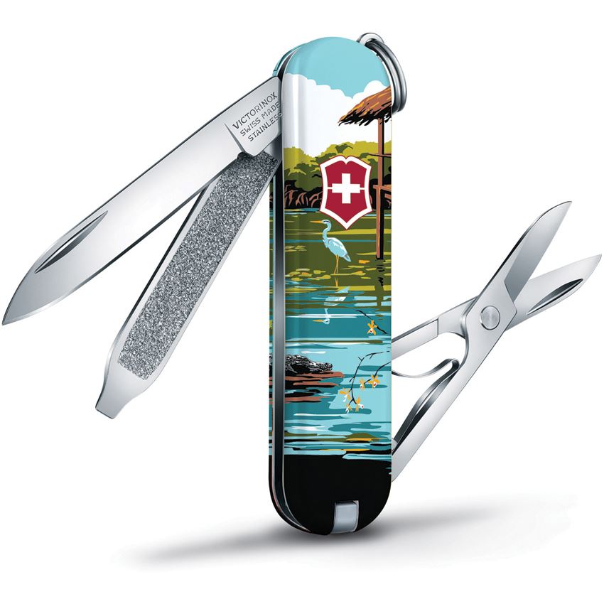 Model/Item/Part Number - VN55492. Swiss Army Classic Knife Everglades National Park Handles. 2.25" (5.72cm) closed. Tools include: Small blade l File l Screwdriver tip l Scissors l Keyring l Toothpick l Tweezers. Everglades National Park handle artwork. Clam packed. Made in Switzerland.