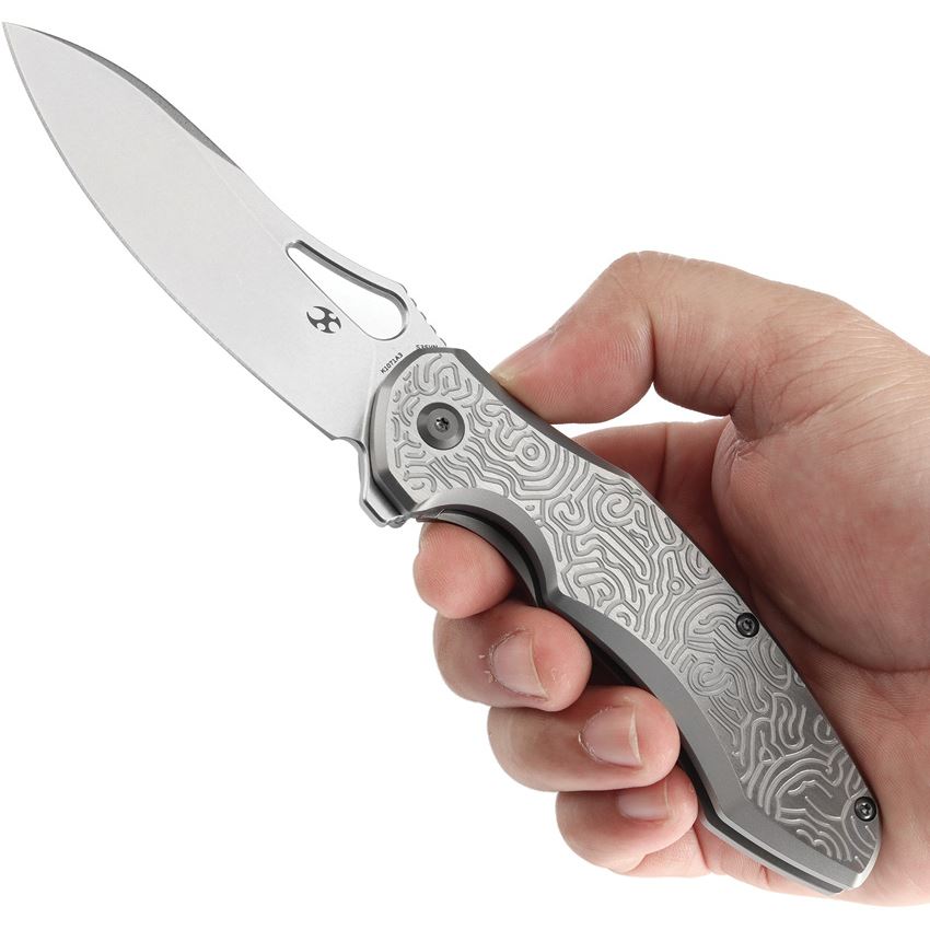 Model/Item/Part Number - K1071A3. Kansept Echis Stonewash Framelock Knife Gray Handles. 4.5" (11.43cm) closed. 3.5" (8.89cm) stonewash finish CPM S35VN stainless drop point blade. Gray textured titanium handle. Extended tang. Thumb pull. Pocket clip. Black nylon pouch. Boxed. Made in China.