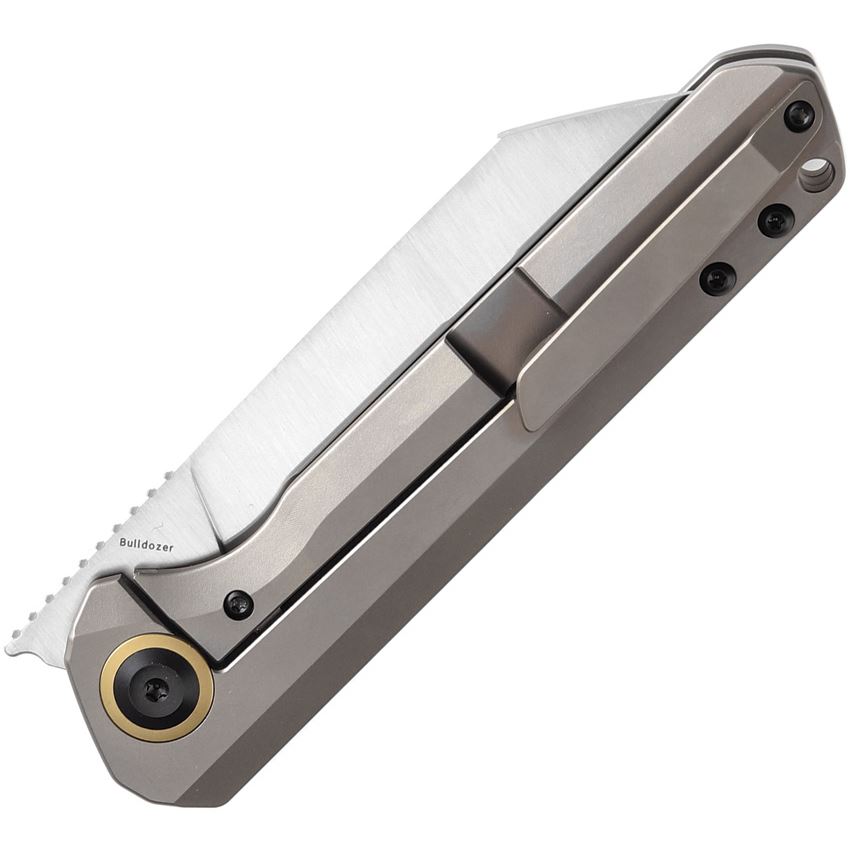 Model/Item/Part Number - K1028A4. Kansept Bulldozer Framelock Knife Bronze Handles. 4.75" (12.07cm) closed. 3.75" (9.53cm) satin finish CPM-20CV stainless blade. Bronze anodized titanium handle. Extended tang. Lanyard hole. Pocket clip. Black nylon pouch. Boxed. Made in China.