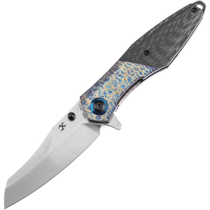 Model/Item/Part Number - K1053A4. Kansept Mistaken Framelock Knife Lightning Handles. 4.38" (11.13cm) closed. 3.25" (8.26cm) satin finish CPM-20CV stainless blade. Lightning strike titanium handle with Twill carbon fiber inlay. Extended tang. Thumb stud. Lanyard hole. Timascus pocket clip. Black nylon pouch. Boxed. Made in China.