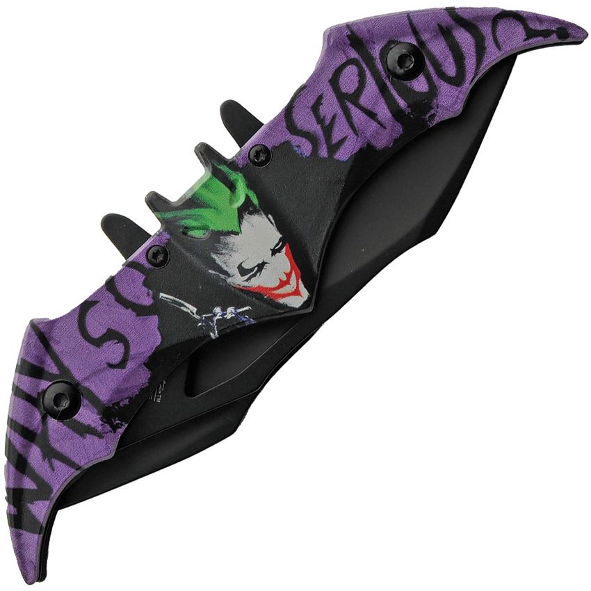 Model/Item/Part Number - CN300609PU. Rite Edge Why So Serious Assist Open Black Linerlock Knife Black/Purple Handles. Assisted opening. 5.5" (13.97cm) closed. 3" (7.62cm) black finish stainless curved blade. Black and purple aluminum handle. Thumb pull. Extended tang. Pocket clip. Dual blades. 3D printed Joker handle artwork. Boxed. Made in China.