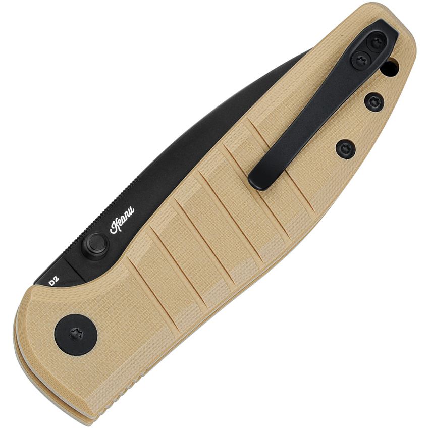 Model/Item/Part Number - BTKMK10F. Bestech Bestechman Goodboy Jr. Black D2 Carbon Steel Knife Tan G10 Handles. 4" (10.16cm) closed. 2.88" (7.32cm) black PVD coated D2 tool steel blade. Khaki G10 handle. Thumb stud. Lanyard hole. Pocket clip. Boxed. Made in China.