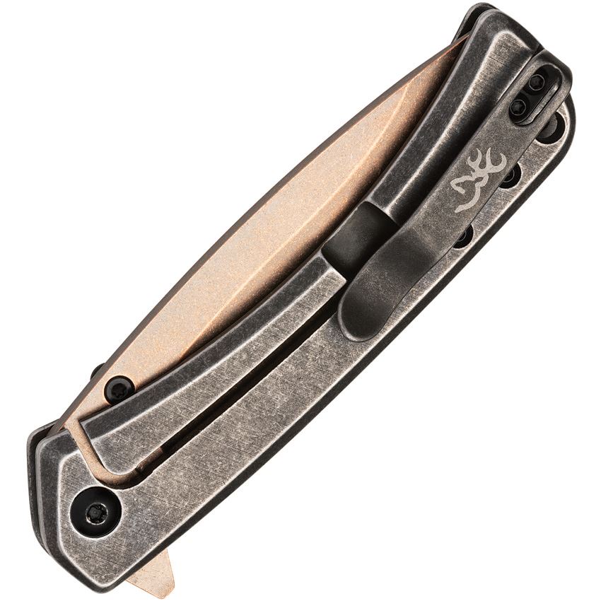 Model/Item/Part Number - BR0544B. Browning Jericho D2 Drop Point Framelock Knife Black/Copper Handles. 3.5" (8.89cm) closed. 3" (7.62cm) D2 tool steel drop point blade. Black stonewash finish stainless handle with copper inlay. Extended tang. Thumb stud. Lanyard hole. Pocket clip. Electroplated copper wash blade with black oxide stonewash finish. Made in China.