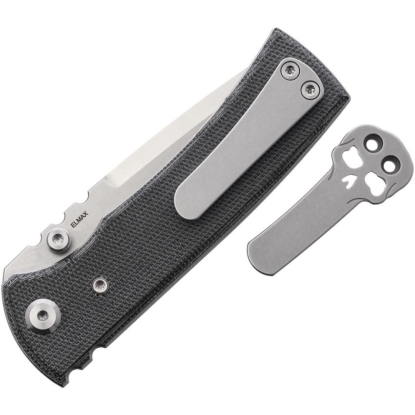 Model/Item/Part Number - CHAV14234. Chaves Redencion Street Two Tone Elmax Drop Point Linerlock Knife Black Micarta Handles. Blue Label Series. 4" (10.16cm) closed. 3" (7.62cm) stonewash and satin finish Elmax steel drop point blade. Black canvas micarta handle. Thumb stud. Pocket clip. Comes with signature Chaves skull titanium pocket clip. Boxed. Made in China.