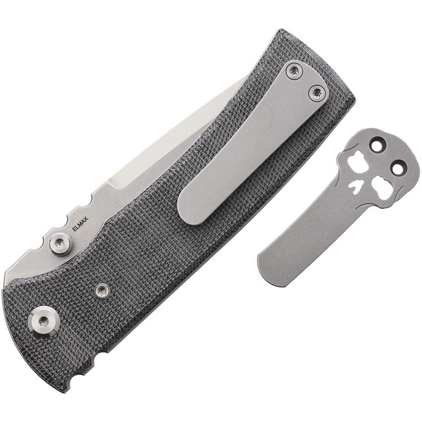 Model/Item/Part Number - CHAV14231. Chaves Redencion 229 Two Tone Elmax Tanto Point Linerlock Knife Black Micarta Handles. Blue Label Series. 4.5" (11.43cm) closed. 3.5" (8.89cm) stonewash and satin finish Elmax steel tanto blade. Black canvas micarta handle. Thumb stud. Pocket clip. Comes with signature Chaves skull titanium pocket clip. Boxed. Made in China.