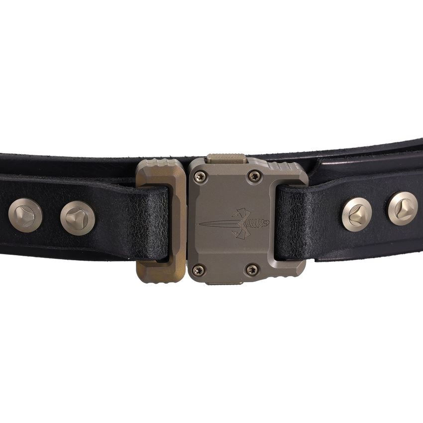 Model/Item/Part Number - MFC700APISBK. Marfione APIS Belt Black. Black buffalo leather. Bronze titanium buckle with bronze hardware. 1.7" width. Fits up to 40" waist. Buckle is secured with Velcro straps. Boxed. Proudly made in the USA.
