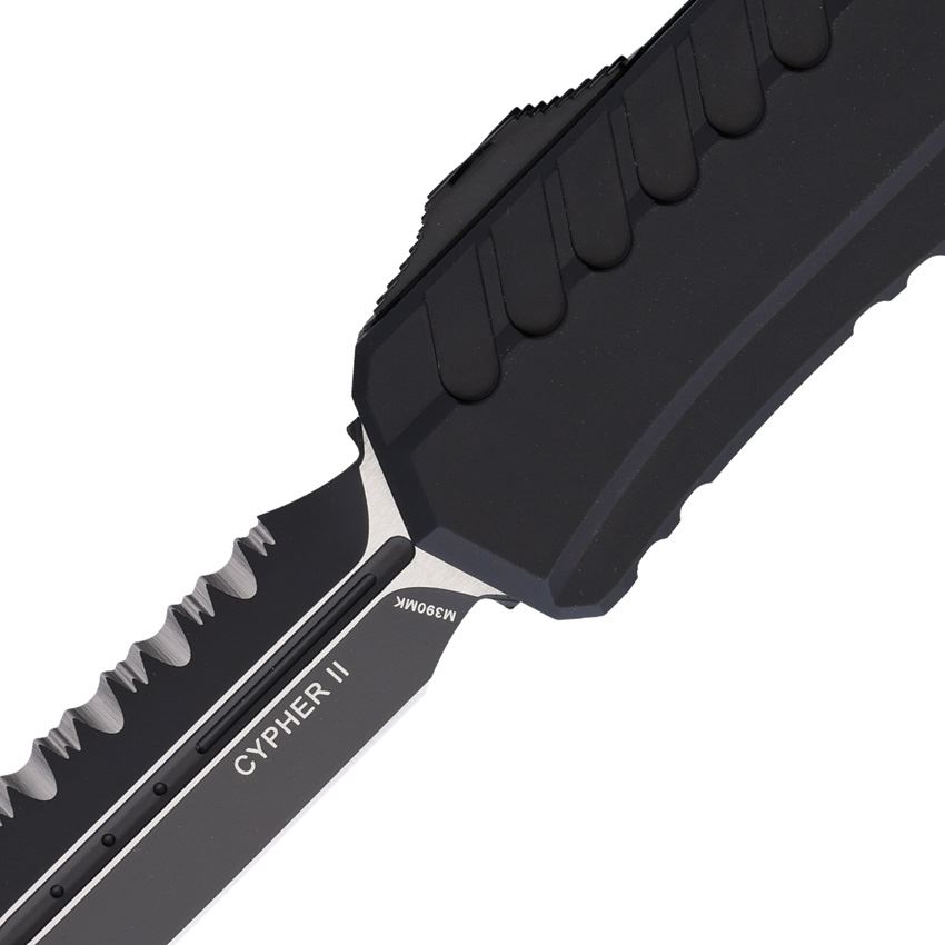 Model/Item/Part Number - MCT12423T. Microtech Auto Cypher II Serrated Two Tone Double Edge Dagger OTF Knife Black Handles. Automatic opening. 5" (12.7cm) closed. 3.5" (8.89cm) two-tone finish serrated Bohler M390MK stainless dagger blade. Black aluminum handle. Pocket clip. Lanyard hole. Glass breaker. Double edge blade. Boxed. Proudly made in the USA.