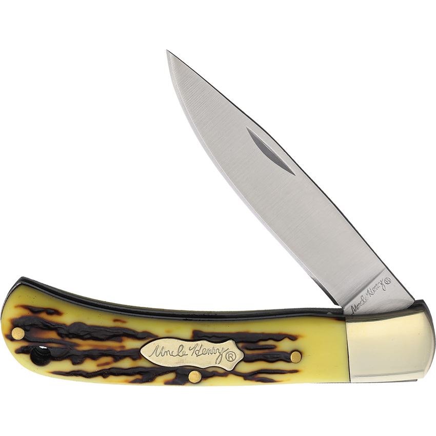 Model/Item/Part Number - SCHP1207766. Schrade Uncle Henry Gift Set Jigged Delrin Handles. Satin finish stainless blade. Jigged Delrin handle. Includes: 7" overall fixed blade with 3.25" drop point blade; 3.5" closed lockback with 2.5" spear point blade; Deck of playing cards; Gift tin. Clam packed. Made in China.