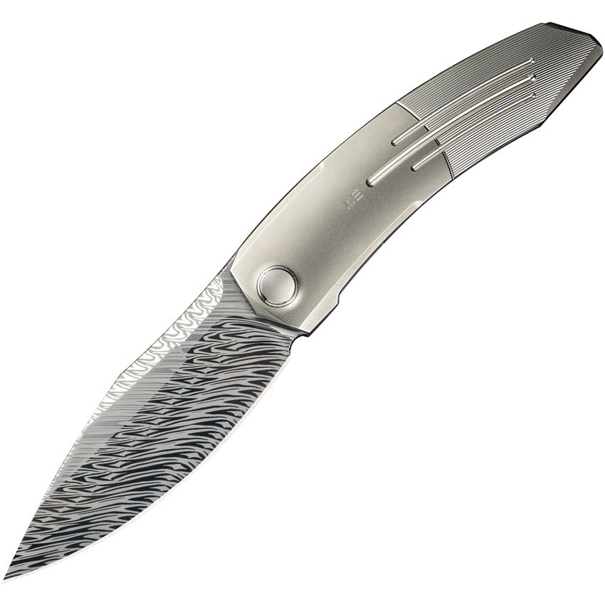 Model/Item/Part Number - WE23069BDS1. We Sine Wave Nested Damasteel Linerlock Knife Gray Handles. 4.88" (12.4cm) closed. 3.88" (9.86cm) Damasteel blade. Bead blast finish titanium handle. Extended tang. Pocket clip. Black nylon zippered storage case. Boxed. Made in China.
