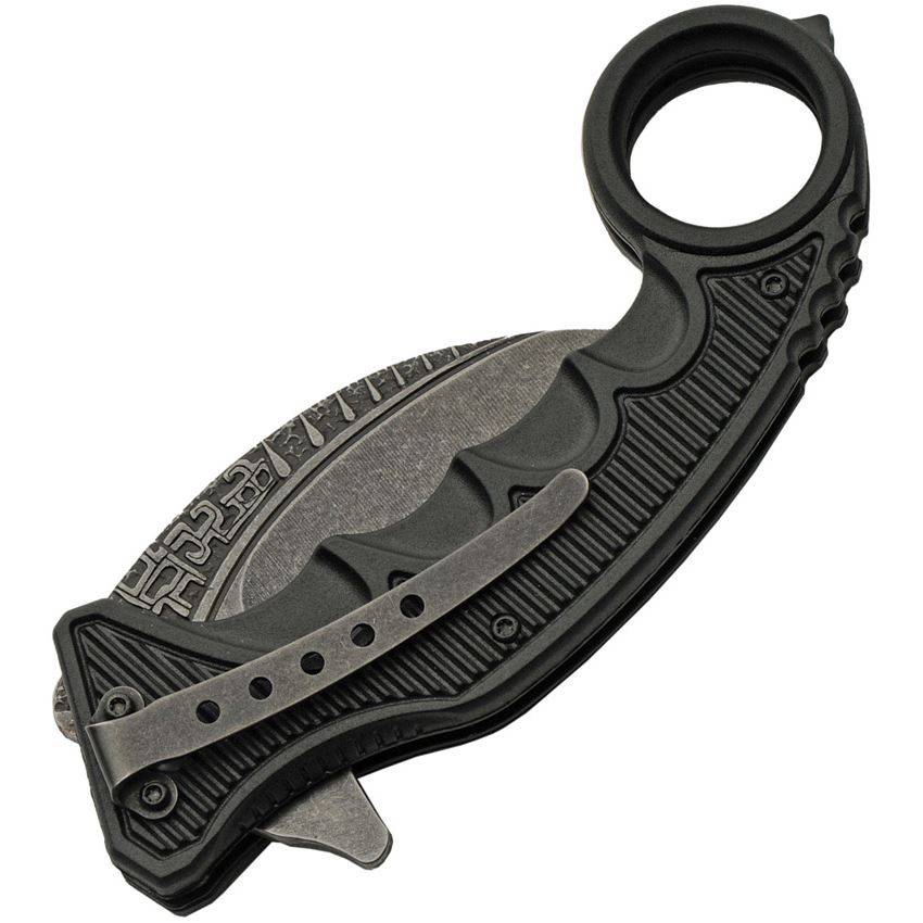 Model/Item/Part Number - CN300612BK. Rite Edge Assist Open Gothic Black Stonewash Karambit Linerlock Knife Black. Assisted opening. 5.75" (14.61cm) closed. 3.25" (8.26cm) black stonewash finish 3Cr13 stainless karambit blade. Black ABS handle with Black stonewash stainless onlay. Extended tang. Finger ring. Pocket clip. Glass breaker. Boxed. Made in China.