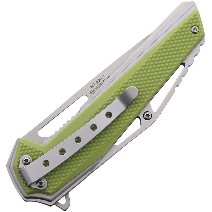 Model/Item/Part Number - MTA2011GN. MTech Assist Open Linerlock Knife Green. Assisted opening. 4.75" (12.07cm) closed. 3.63" (9.22cm) bead blast finish 3Cr13 stainless blade. Green injection molded nylon handle. Extended tang. Thumb pull. Lanyard hole. Pocket clip. Boxed. Made in China.