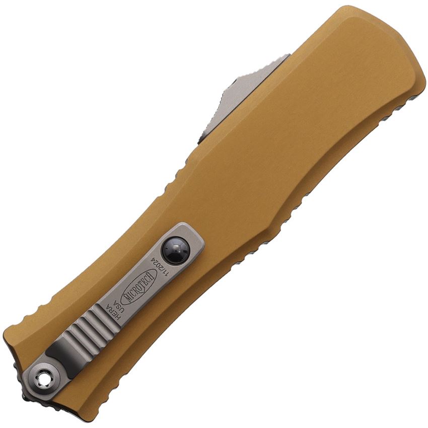 Model/Item/Part Number - MCT1705M4TA. Microtech Auto Hera II Mini Satin Recurve OTF Knife Tan. Automatic opening. 4" (10.16cm) closed. 3" (7.62cm) satin finish Bohler M390MK stainless recurve blade. Tan aluminum handle. Pocket clip. Lanyard hole. Glass breaker. Boxed. Proudly made here in the USA.
