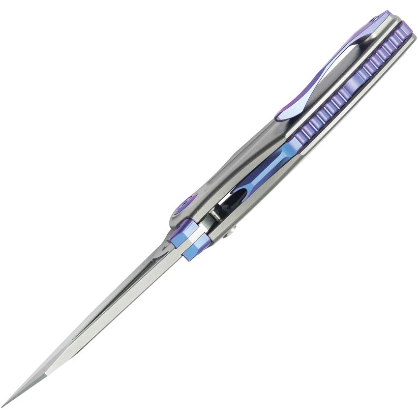 Model/Item/Part Number - KUB400A. Kubey Sumo Stonewash Button Lock Knife Stonewash Titanium Handles. 4.13" (10.49cm) closed. 3.13" (7.95cm) stonewash finish CPM-20CV stainless blade. Stonewash finish titanium handle. Thumb disk. Pocket clip. Blue anodized accents. Boxed. Made in China.