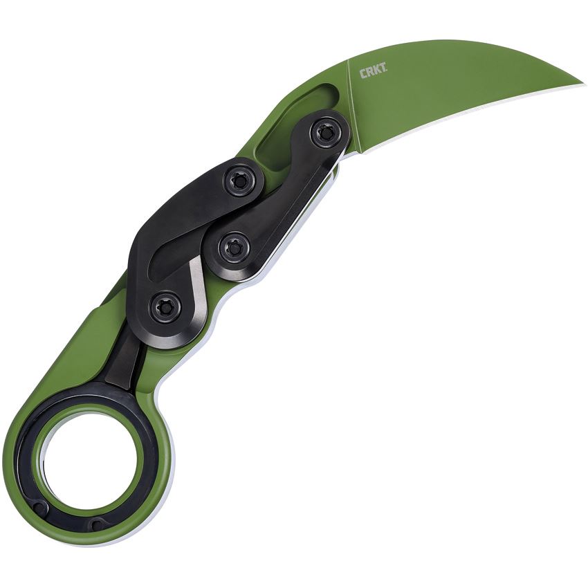 Model/Item/Part Number - CR4040BG. CRKT Provoke Kinematic. 5" (12.7cm) closed. 2.38" (6.05cm) green Cerakote finish D2 tool steel blade. Black aluminum handle. Finger ring. Kinematic innovation deploys the blade quickly for first responders. Designed by Joe Caswell. Boxed. Made in Taiwan.