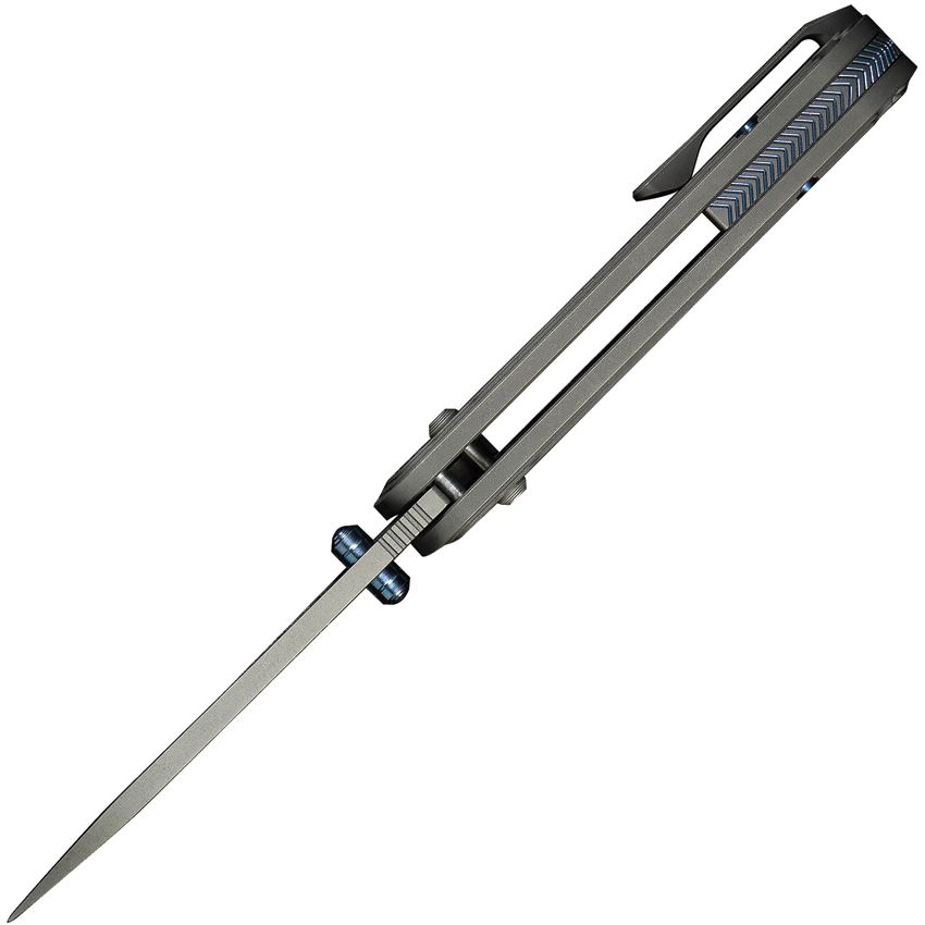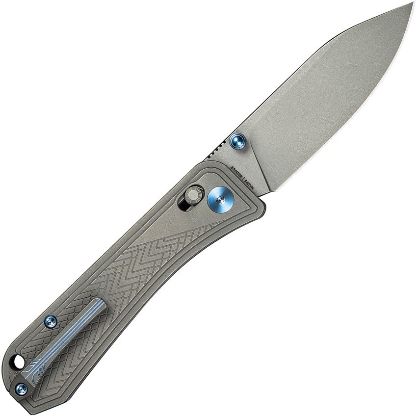 Model/Item/Part Number - WE240092. We Bougie Banter Stonewash Drop Point Crossbar Lock Knife Gray Handles. 3.63" (9.22cm) closed. 3" (7.62cm) stonewash finish S45VN stainless modified drop point blade. Gray titanium handle. Thumb stud. Lanyard hole. Pocket clip. Art Deco handle styling. Black nylon zippered storage case. Boxed. Made in China.