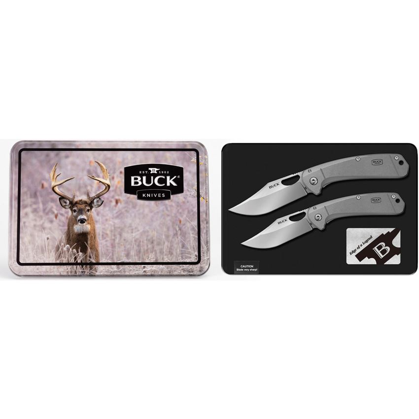 Model/Item/Part Number - BUCMB0238. Buck 788/789 Framelock Knife Combo. Satin finish stainless clip point blade. Silver aluminum handle. Thumb pull. Lanyard hole. Pocket clip. Includes: 788 Framelock 3.75" closed with 2.75" blade; 789 Framelock 3.38" closed with 2.38" blade; Gift tin. Clam packed. Made in China.