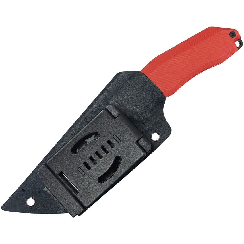 Model/Item/Part Number - KUB382B. Kubey Yokai Black Stonewash tanto Fixed Blade Knife Red G10 Handles. 8.88" (22.56cm) overall. 4.88" (12.4cm) black stonewash finish 14C28N Sandvik stainless tanto blade. Red G10 handle. Full, extended tang. Lanyard hole. Black Kydex belt sheath. Boxed. Made in China.