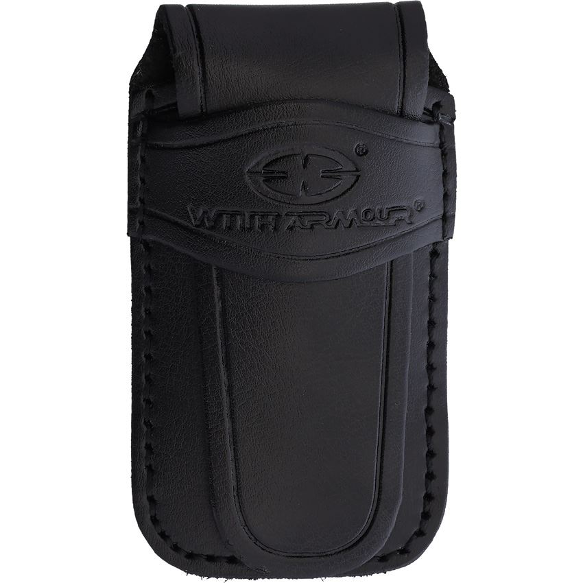 Model/Item/Part Number - WAR079F40CF. WithArmour Fold Muk 2 Satin VG10 Slip Joint Knife Black/Gray Carbon Fiber Handles. 4" (10.16cm) closed. 3" (7.62cm) satin finish VG-10 stainless blade. Black and gray carbon fiber handle. Lanyard hole. Black leather belt sheath. Boxed. Made in China.