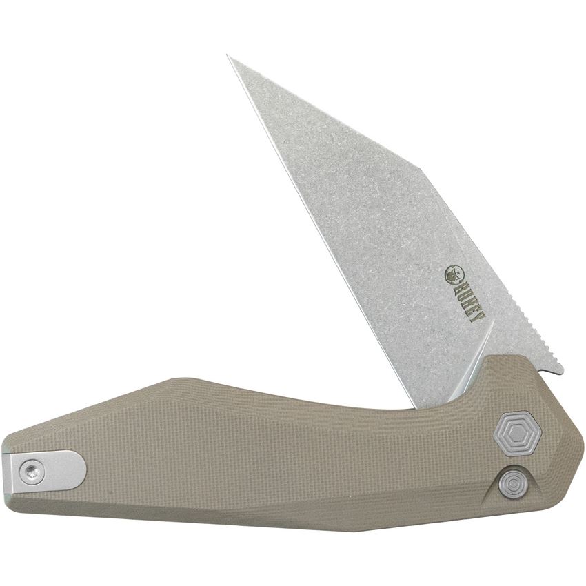 • Kubey Fenrir Stonewash Button Lock Knife Tan G10 Handles