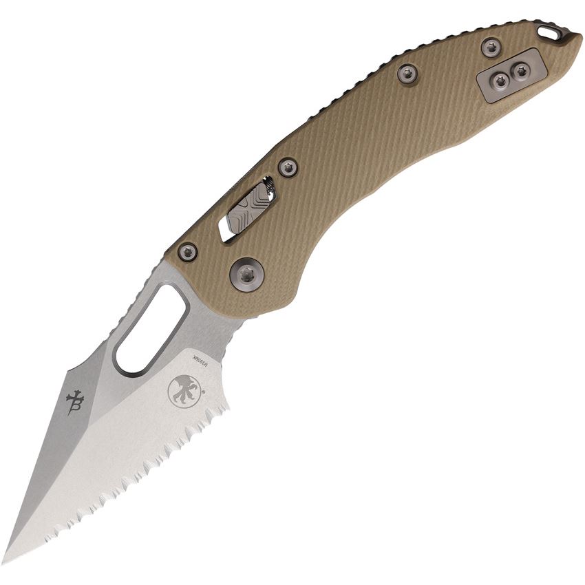 • Microtech Stitch Stonewash Serrated Single Edge Ram Lok Stonewash Tan Handles