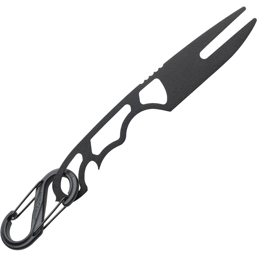 Model/Item/Part Number - TP3PT01. TOPS 3 Putt Golf Divot Tool. 5.63" (14.3cm) overall. Bottle opener. Attachment clip. One-piece black traction coated 1095HC steel construction. Made to look like a Mini Scandi Knife with the forks of the divot where the blade would be. Integrated range finder built into the forks. Bagged. Proudly made here in the USA.