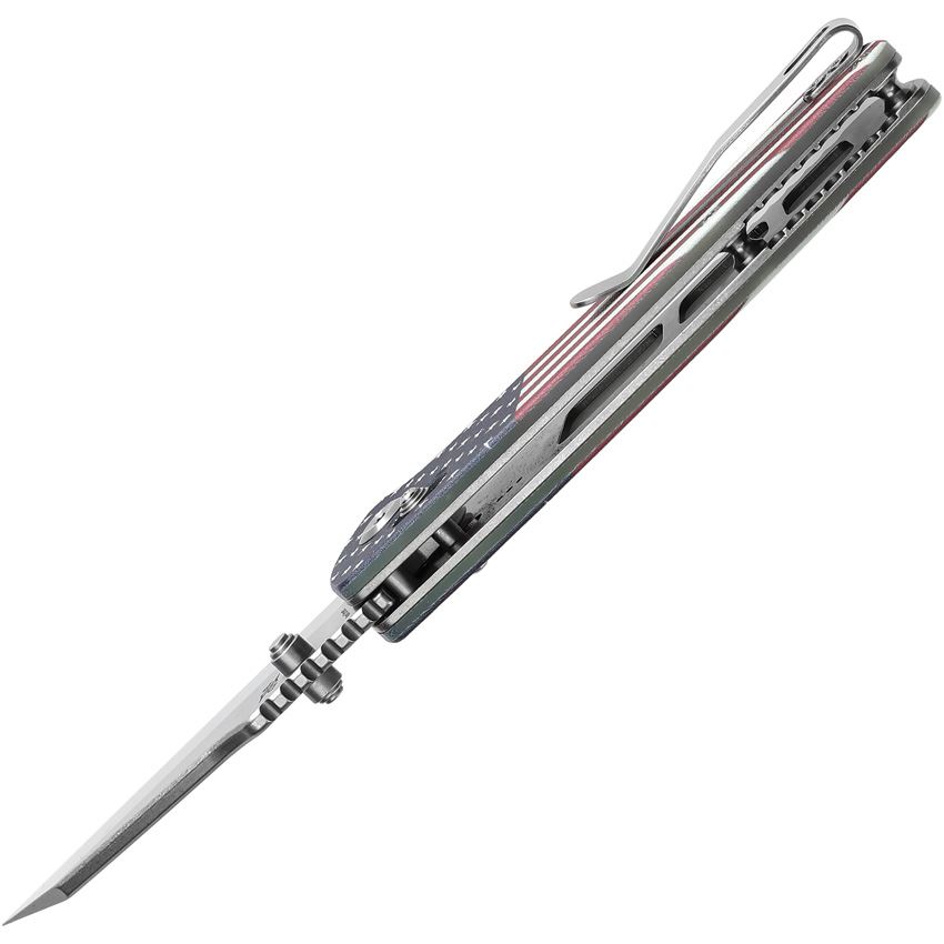 Model/Item/Part Number - KT1015V9. Kansept Main Street Stonewash CrossLock Knife Jade G10 Handles. 4.5" (11.43cm) closed. 3.5" (8.89cm) stonewash finish 154CM stainless blade. Jade G10 handle. Thumb stud. Pocket clip. American flag handle artwork. Black nylon pouch. Boxed. Made in China.