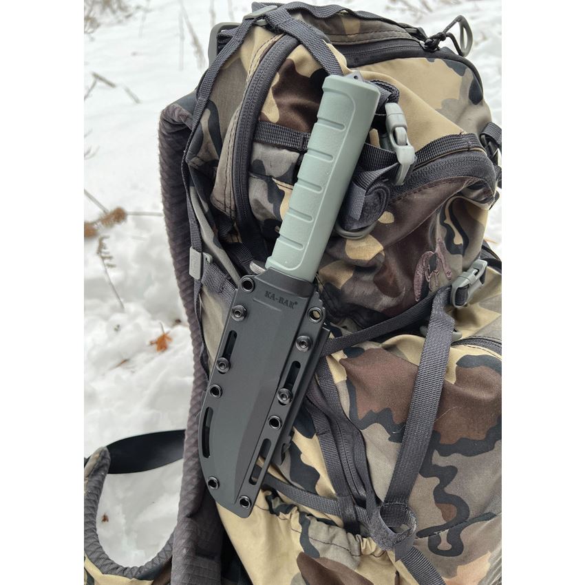Model/Item/Part Number - KA6100. Ka-Bar Dust I Black D2 Carbon Steel Fixed Blade Knife Green Handles. 11" (27.94cm) overall. 6.13" (15.57cm) black finish D2 tool steel blade. Green GFN handle. Glass breaker. Black molded plastic MOLLE compatible belt sheath. Boxed. Made in Taiwan.