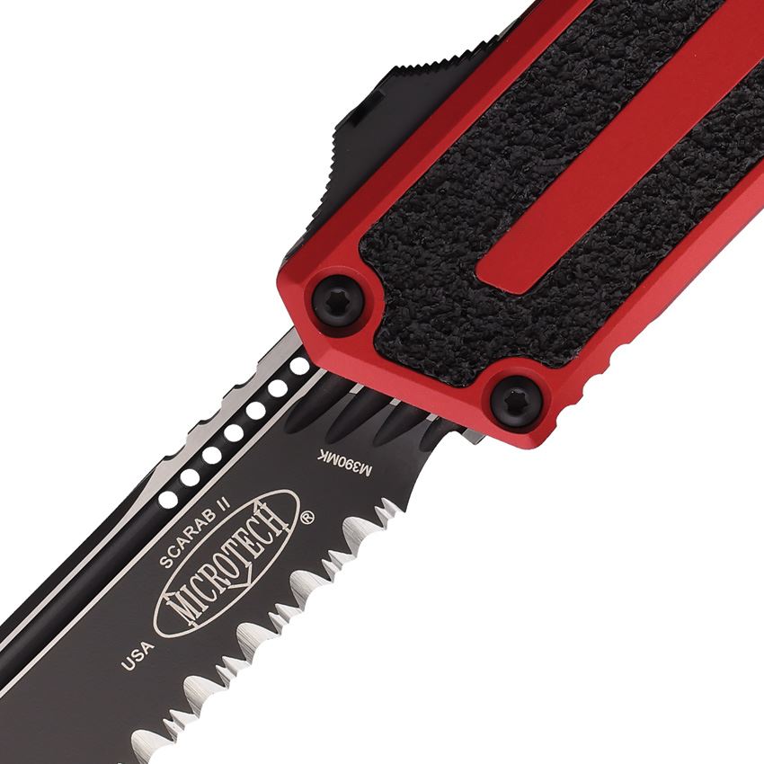 • Microtech Auto Scarab II Gen III Two -Tone Serrated Tanto OTF Knife Red/Black Traction Handles