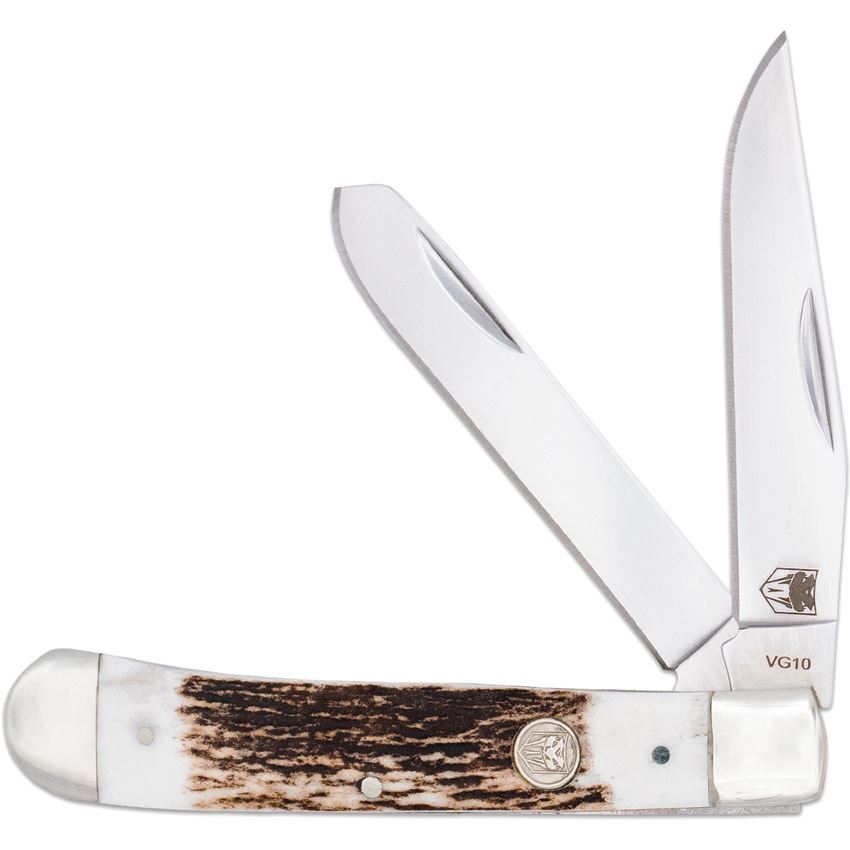 Model/Item/Part Number - CBTTRPSTG. Cobratec Trapper Knife Stag Handles. 4.13" (10.49cm) closed. Mirror finish VG-10 stainless clip and spey blades. Stag handle. Nickel silver bolster(s). Inlay shield. Boxed. Made in China.