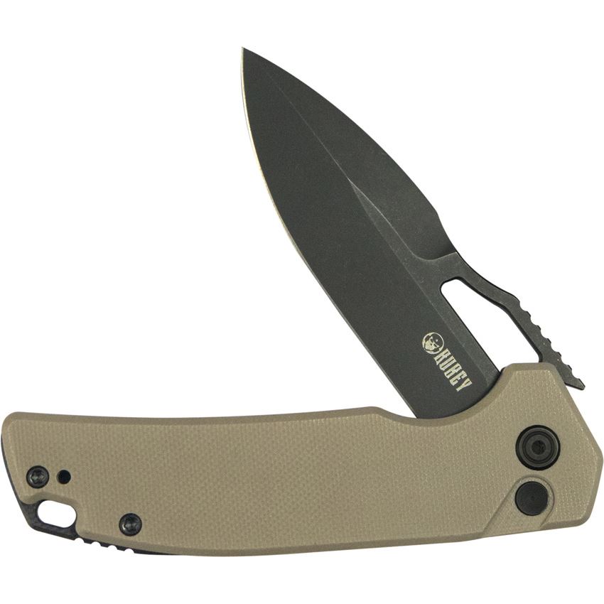 Model/Item/Part Number - KUB316L. RDF Black Stonewash Button Lock Knife Tan G10 Handles. 4.25" (10.8cm) closed. 3.13" (7.95cm) black stonewash finish 14C28N Sandvik stainless blade. Tan G10 handle. Extended tang. Thumb pull. Lanyard hole. Pocket clip. Boxed. Made in China.