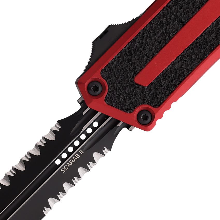Microtech 12802RD Auto Scarab II Gen III Two-Tone Part Serrated Double Edge Dagger OTF Knife Red/Black Traction Handles