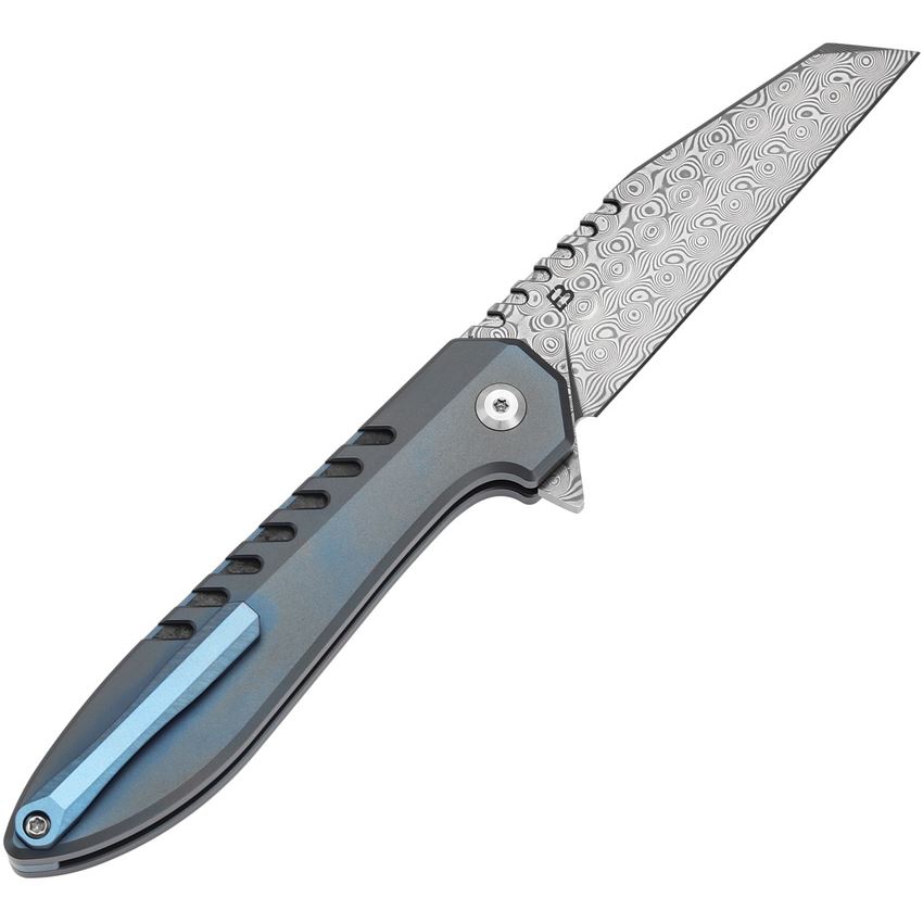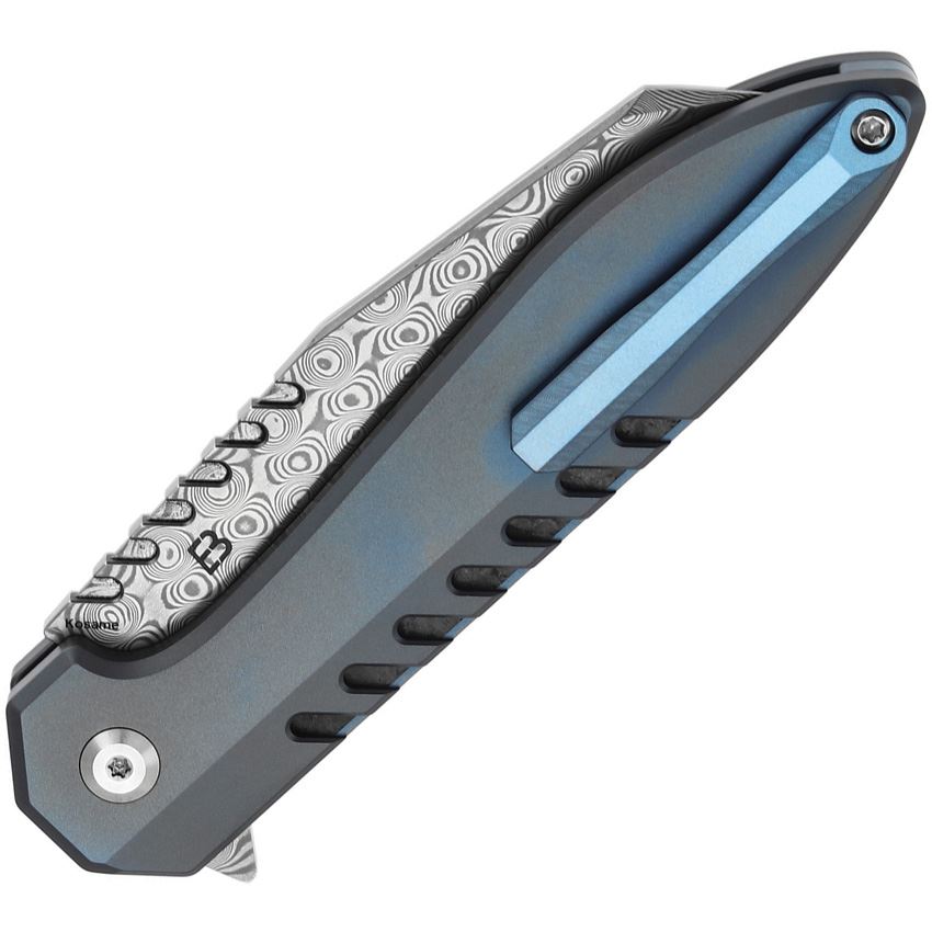 Model/Item/Part Number - KT1093F1. Kansept Kosame Damascus Wharncliffe Button Lock Knife Blue/Shredded Carbon Fiber Handles. 4.5" (11.43cm) closed. 3.38" (8.59cm) Damascus steel Wharncliffe blade. Blue anodized titanium handle with Shredded carbon fiber inlay. Extended tang. Pocket clip. Black nylon pouch. Boxed. Made in China.