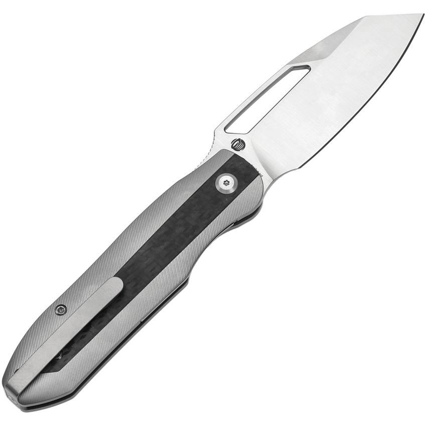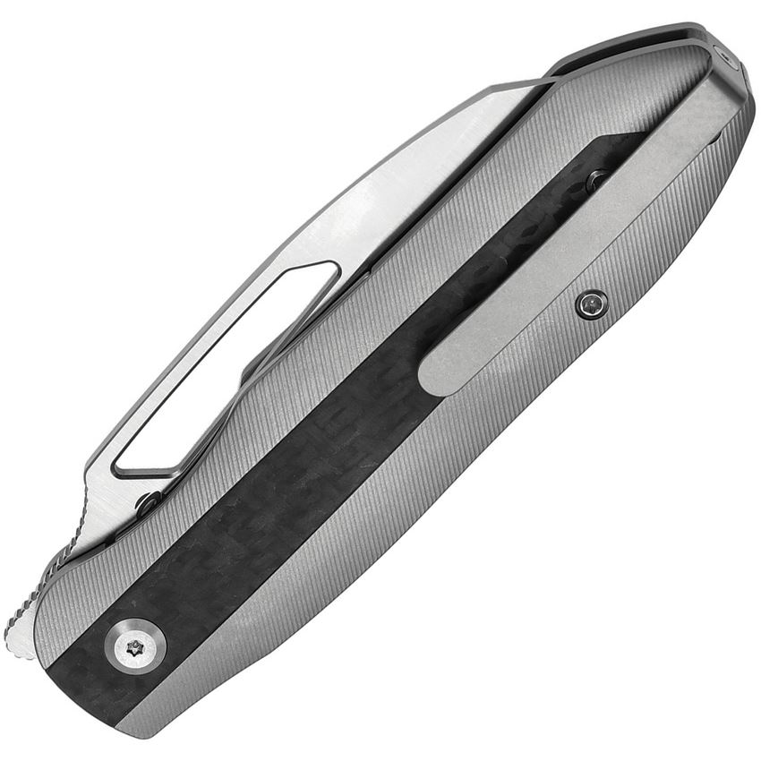 Model/Item/Part Number - K1106A2. Kansept Thunderhead Satin Reverse Tanto Linerlock Knife Bead Blast/Twill carbon Fiber Handles. 4.63" (11.76cm) closed. 3.63" (9.22cm) satin finish CPM S35VN stainless reverse tanto blade. Bead blast finish titanium handle with Twill carbon fiber inlay. Extended tang. Thumb pull. Pocket clip. Black nylon pouch. Boxed. Made in China.