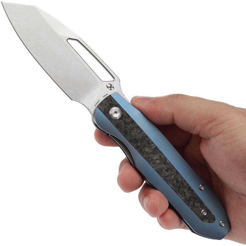 Model/Item/Part Number - K1106A3. Kansept Thunderhead Stonewash Reverse Tanto Linerlock Knife Blue/Shread Carbon Fiber Handles. 4.63" (11.76cm) closed. 3.63" (9.22cm) stonewash finish CPM S35VN stainless reverse tanto blade. Blue anodized titanium handle with Shredded carbon fiber inlay. Extended tang. Thumb pull. Pocket clip. Black nylon pouch. Boxed. Made in China.