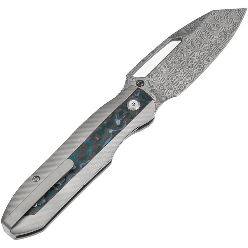 Model/Item/Part Number - K1106A5. Kansept Thunderhead Damascus Reverse Tanto Linerlock Knife Stonewash/Artic Storm Fat Carbon Fiber Handles. 4.63" (11.76cm) closed. 3.63" (9.22cm) Damascus steel reverse tanto blade. Stonewash finish titanium handle with Arctic Storm Fat carbon fiber inlay. Extended tang. Thumb pull. Pocket clip. Black nylon pouch. Boxed. Made in China.