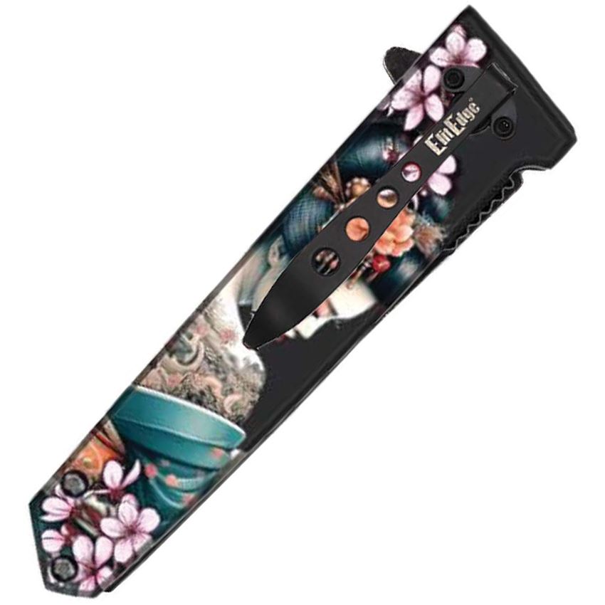 Model/Item/Part Number -EE10A102MKG. ElitEdge - Assist Open Linerlock Knife Flower Maiko Handles. Assisted opening. 4.75" (12.07cm) closed. 3.75" (9.53cm) black finish 420C stainless tanto blade. ABS handle. Extended tang. Pocket clip. Maiko flower blade and handle artwork. Boxed. Made in China.