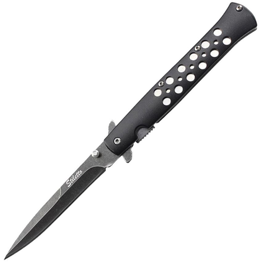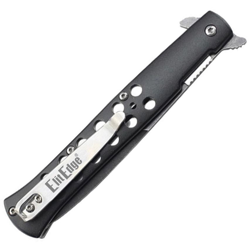 Model/Item/Part Number -EE10A128BK. ElitEdge - Assist Open Linerlock Knife Black Handles. Assisted opening. 4.75" (12.07cm) closed. 3.75" (9.53cm) black stonewash finish stainless spear point blade. Black aluminum handle. Extended tang. Thumb stud. Pocket clip. Boxed. Made in China.