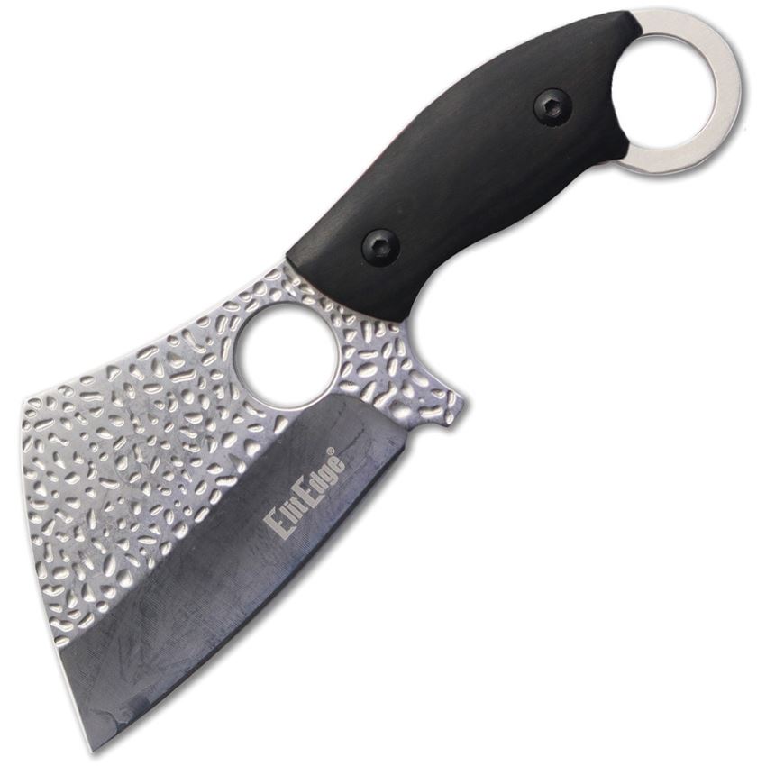Model/Item/Part Number -EE20664SB. ElitEdge - Satin Cleaver Fixed Blade Knife Black Wood Handles. 7.25" (18.42cm) overall. 3.75" (9.53cm) satin finish stainless cleaver style blade. Black wood handle. Full, extended tang. Finger ring. Black nylon belt sheath. Boxed. Made in China.